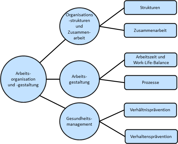 In der Grafik sehen Sie die Gestaltungsfelder und zugehörigen Instrumente zum Thema „Arbeitsorganisation und -gestaltung“ in der Pflege. Bitte klicken Sie die jeweiligen Felder an, um weiterführende Informationen zu erhalten.
